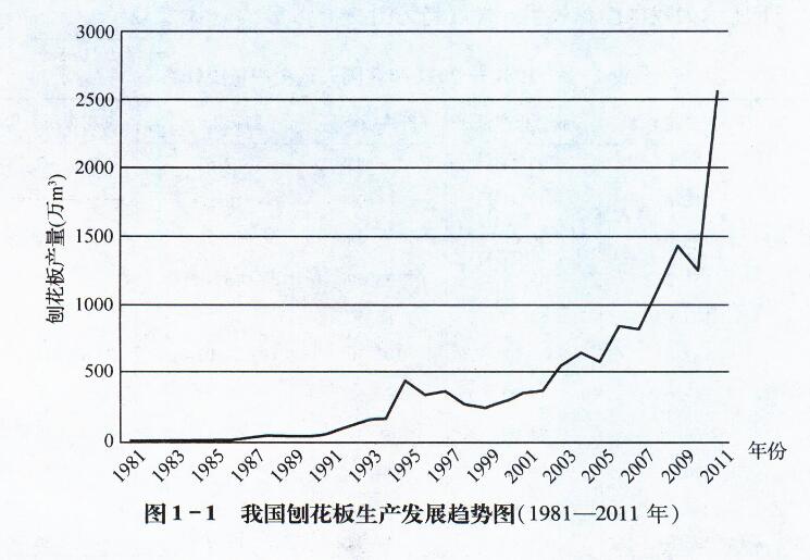 我國的刨花板工業(yè)經(jīng)歷了由20世紀(jì)80年代上升到90年代下降,再由21世紀(jì)上升的反復(fù)過程。創(chuàng)花板產(chǎn)量從1962年的5413m3,到2011年的2559.39萬m3, 50年間增長了4727倍。表1為1981-2011年我國人造板產(chǎn)量統(tǒng)計,可以看出刨花板所占份額。圖1-1所示為我國刨花板生產(chǎn)發(fā)展趨勢圖。